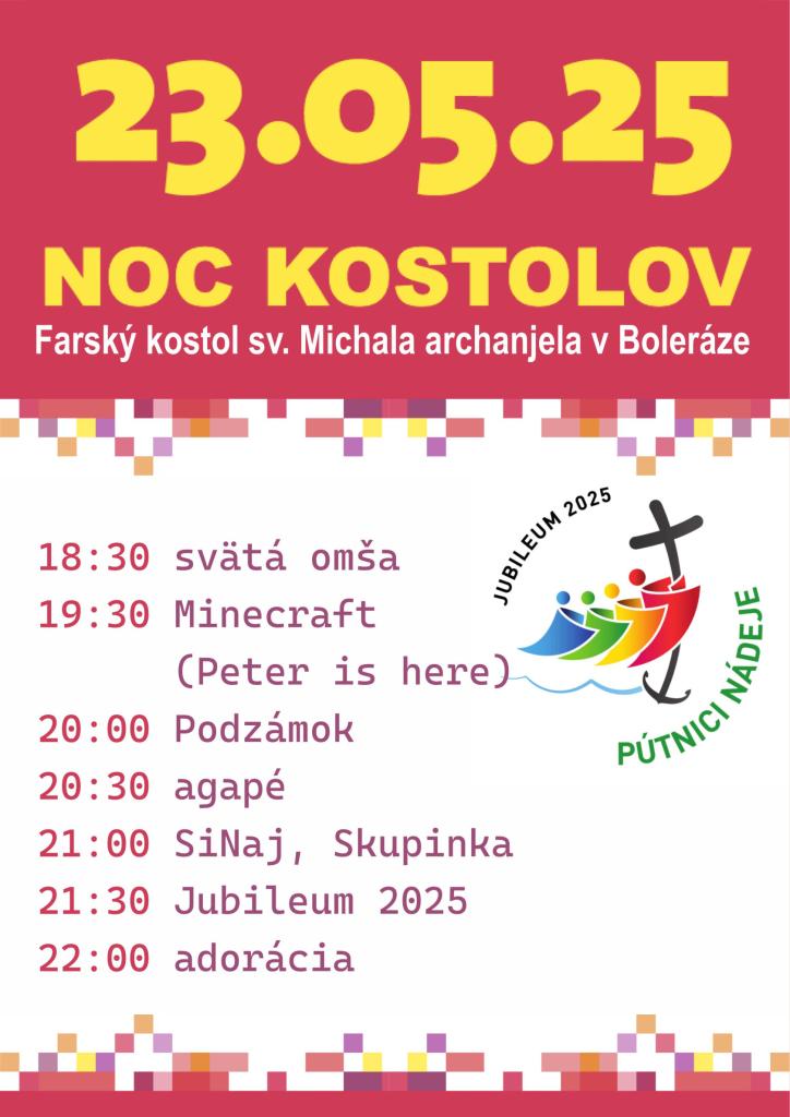 Pozývame Vás všetkých na Noc kostolov. Začiatok je v piatok 23. 5. 2025 o 18:30 hod. v kostole svätého Michala archanjela v Boleráze. Spolu s duchovným programom (svätá omša, adorácia) sú pripravené aj koncerty domácich zborov a súborov (Podzámok, Skupinka, Sinaj)
