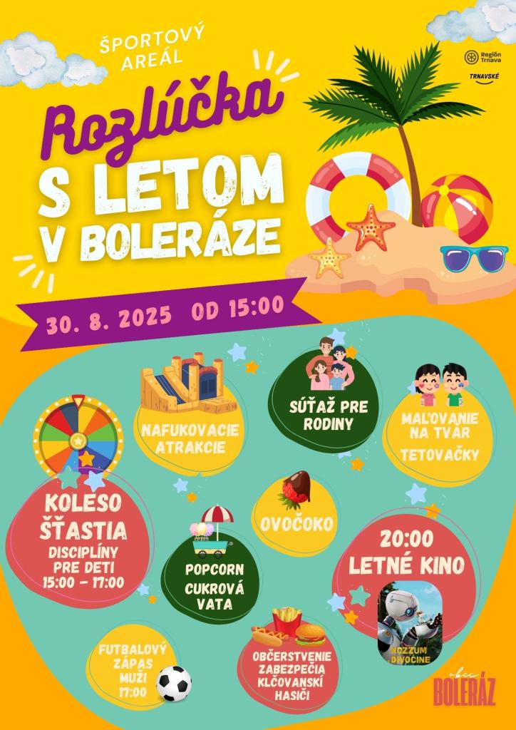 V sobotu 30. augusta Vás pozývame do areálu ihriska na tradičnú Rozlúčku s letom. Opäť sme si pre Vás pripravili bohatý program so súťažami, nafukovacie atrakcie, maľovanie na tvár a farebné tetovačky, nebude chýbať ani večerné kino a občerstvenie od klčovanských hasičov.