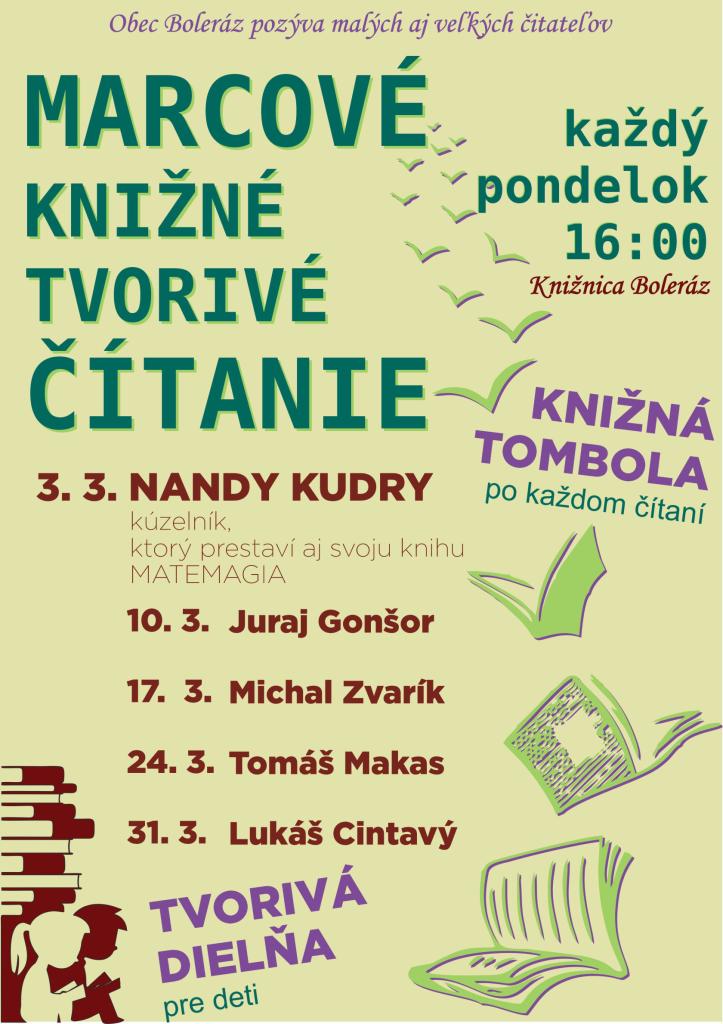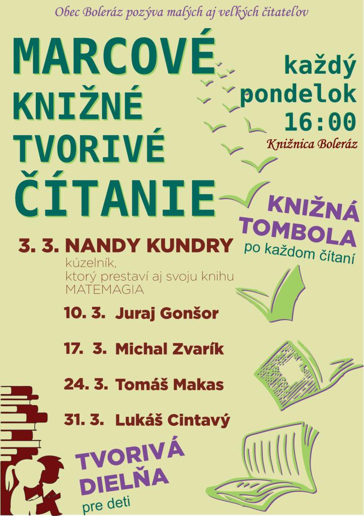 Pozývame malých aj veľkých čitateľov na pondelkové marcové čítanie. Pre deti je prichystaná TVORIVÁ DIELŇA a KNIŽNÁ TOMBOLA!!!